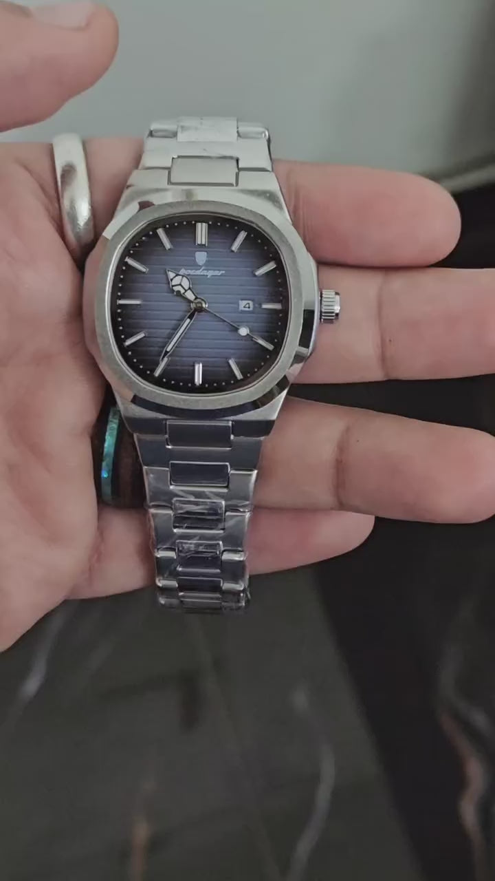 Elevate your style with the Nautilus Black-Blue Silver Watch, a perfect blend of sophistication and durability. Designed with a brushed stainless-steel case and integrated bracelet, this timepiece delivers a bold yet refined presence on your wrist.